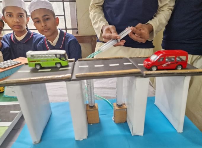 অষ্টম শ্রেণীর শিক্ষার্থী তামজিদ, জামিল ও হুজাইফা উদ্ভাবন করেছে হাইড্রোলিক ব্রিজ| এটা কীভাবে কাজ করবে? তামজিদ বলে, ‘জোয়ার-ভাটায় তো নদীতে পানির উচ্চতা বেড়ে যায়, তাই হাইড্রোলিক শক্তি ব্যবহার করে আমরা এর নকশা প্রস্তুত করেছি| পানির উচ্চতা বেড়ে গেলে হাইড্রোলিক শক্তি ব্যবহার করে ব্রিজটির একাংশ উপর দিকে উঠে যাবে, ফলে নৌযান এর নিচ দিয়ে চলতে পারবে| নৌকো বা জাহাজ চলে গেলে ব্রিজটি আবার আগে অবস্থানে ফিরে যাবে|’