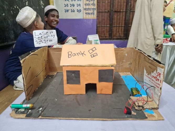 লেজার সিকিউরিটি সিস্টেম নিয়ে এসেছে সপ্তম শ্রেণীর শিক্ষার্থী সায়েম, ষষ্ঠ শ্রেণীর শিক্ষার্থী রকিবুল ও শফিকুল| তারা জানাল, ব্যাংক ও বাসা-বাড়ির নিরাপত্তায় এই সিস্টেম কাজ দেবে| নিরাপত্তা প্রহরীর চোখ ফাঁকি দিয়ে অননুমোদিত কেউ এসে ঢুকে পড়লে সঙ্গে সঙ্গে কন্ট্রোল রুমে সিগন্যাল চলে যাবে|